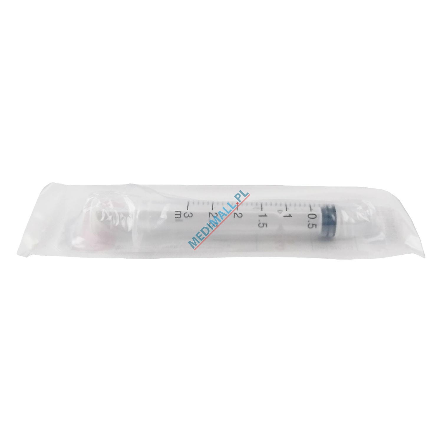 Trzyczęściowa strzykawka do infuzji podskórnych, domięśniowych i dożylnych. Wyposażona w gumowany (nie zawierający lateksu) tłok i ogranicznik na końcu cylindra -zapobiegający wypadaniu tłoka. Końcówka typu Luer Lock (LL) zabezpiecza przed przypadkowym zsunięciem się igły. Cylinder wykonany z przezroczystego tworzywa sztucznego z wyraźną podziałką umożliwia pełną wizualną kontrolę zawartości preparatu. Wszystkie strzykawki pakowane sterylnie w blistry foliowo-papierowe.Pojemność: 3ml