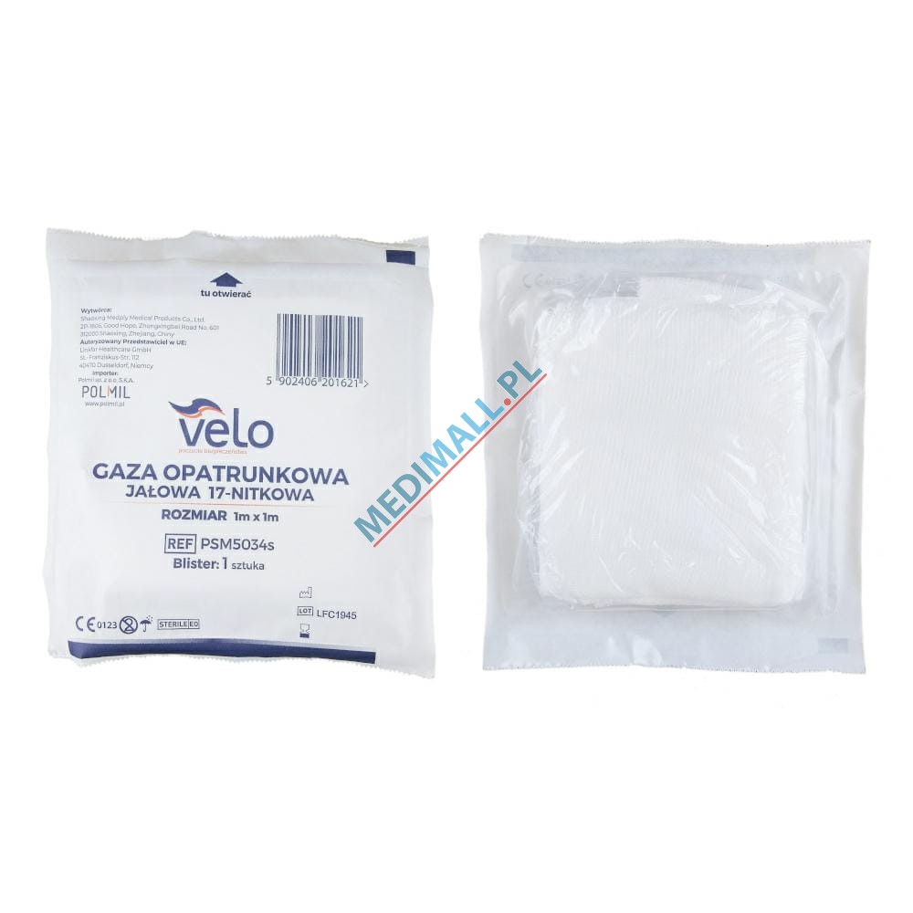 17-nitkowa gaza VELO ze 100% bawełnianej gazy bielonej o wysokim progu wchłaniania. Gazę jałową poddano sterylizacji tlenkiem etylenu. Przeznaczenie: Oczyszczanie i opatrywanie ran w przestrzeni szpitalnej, ambulatoryjnej, zabiegowej.Właściwości: