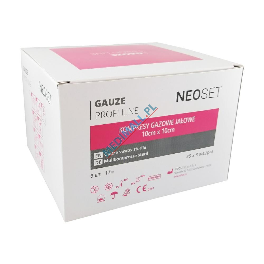 Gauze swabs STERILE 17T 8L 10x10cm 3pcs NEOSET PROFI LINE (25 peel pouches x 3pcs) BOX ref. NGS25023