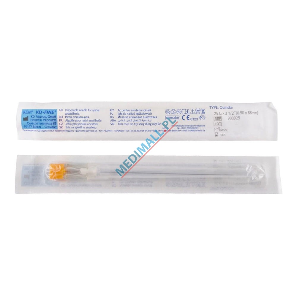 Sterile single-use KD-Fine needle used for lumbar anesthesia and lumbar puncture examination. Thin-walled needle made of medical-grade stainless steel with a polypropylene hub and Quincke tip.