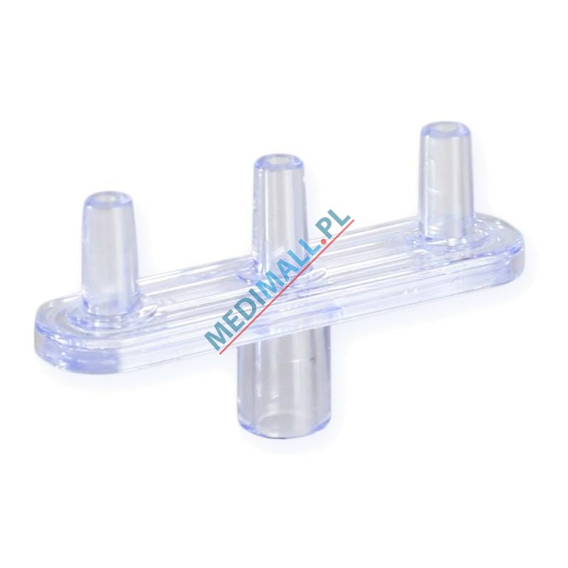 The Meso-Relle module without needles in a linear configuration for 3 needles for various types of procedures and treatment areas. Individual needles should be mounted on the plate, with length and diameter chosen according to the used preparation and the performed mesotherapy procedure. The standard connector allows easy connection to any luer syringe. The special design of the module ensures even distribution of the product through all needles.