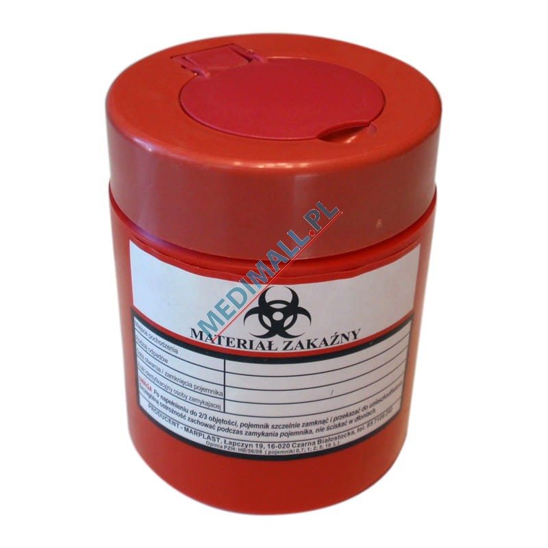 These medical waste containers are PZH certified. They are labeled with a warning sign and instructions for use.