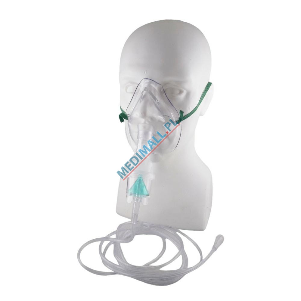 Oxygen mask with tubing and nebulizer. Designed to generate an aerosol containing finely divided medication, which is to be delivered deep into the respiratory system as the patient inhales.