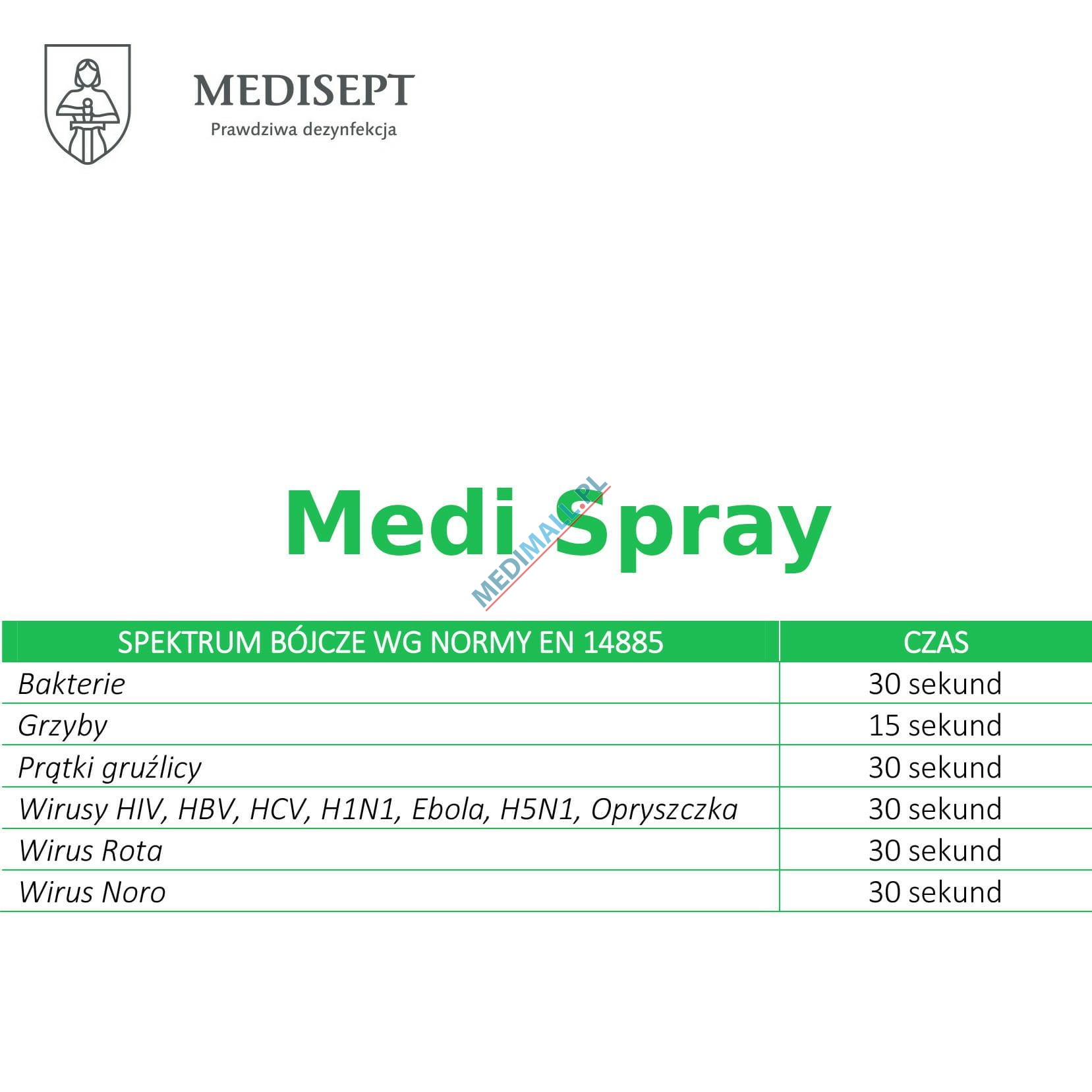 Alkoholowy środek do dezynfekcji sprzętu medycznego (łóżek, foteli, aparatury medycznej etc.) oraz małych powierzchni odpornych na działanie alkoholi. Doskonale sprawdzi się również do dezynfekcji końcówek stomatologicznych i łyżek do wycisków przed sterylizacją. Medi Spray może być stosowany do materiałów mających kontakt z żywnością. Wolny od aldehydu i fenolu. Nie pozostawia smug i szybko odparowuje. Pozytywnie zaopiniowany przez Famed w zakresie tolerancji materiałowej na tworzywo ABS i materiały obiciowe. Zapach: Neutral