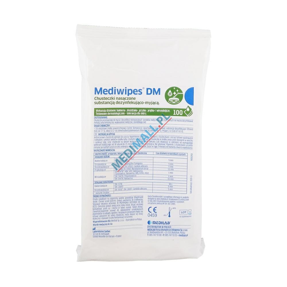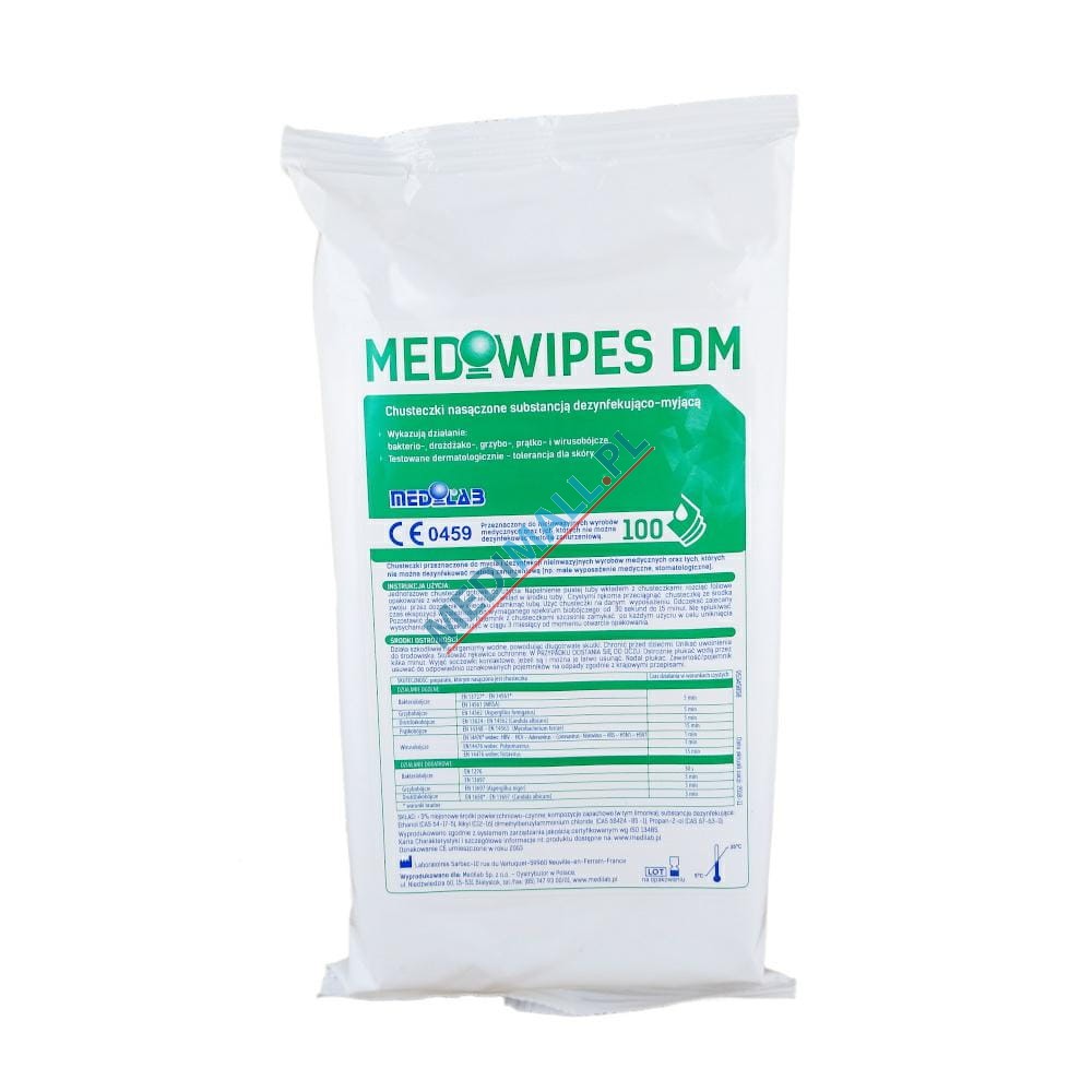 < 5% niejonowe środki powierzchniowo-czynne; substancje dezynfekujące: etanol (1%), chlorek benzalkonium (0,1%), alkohol izopropylowy (0,1%); kompozycje zapachoweMEDIWIPES DM opakowanie