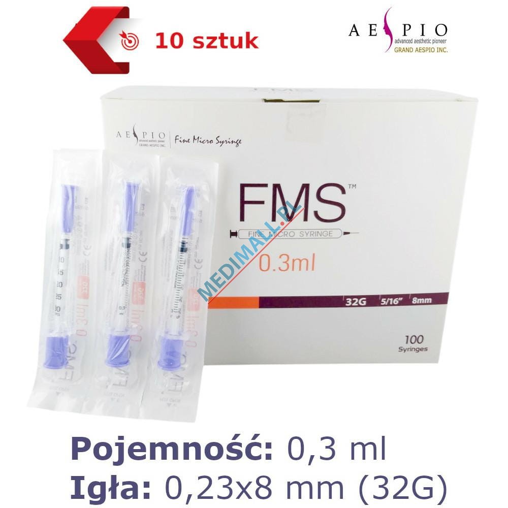 Igła zatsosowana w strzykawkach FMS produkowana jest w technologi ultra cienkiej ścianki i jest jedną z najostrzejszych igieł dostępnych na rynku. Doskonała do wstrzykiwania toksyny botulinowej, kolagenu, kwasu hialuronowego, miejscowych środków znieczulających, mezoterapii, PRP, hialuronidazy, insuliny i innych roztworów. Płynne działanie tłoka – wymaga mniejszej siły nacisku na tłok przy iniekcji (większa precyzja, mniejszy ból i straty na produkcie)ndywidualnie pakowane zapewnienia maksymalną jałowość.Pojemność strzykawki: 0,3 ml