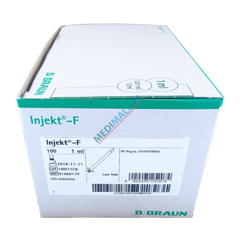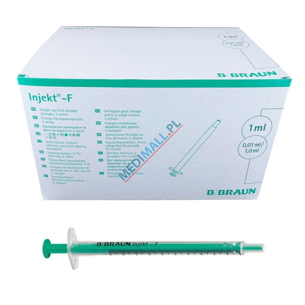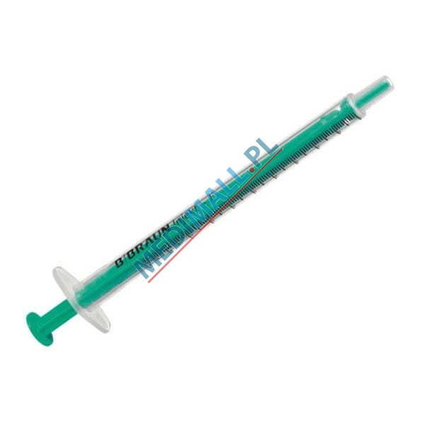 1 mililitrowa strzykawka 2-częściowa wykonana z medycznego polipropylenu/polietylenu. Cylinder strzykawki z przezroczystego tworzywa z wytłoczoną bardzo wyraźną podziałką. Cylinder zakończony blokadą uniemożliwiającą przypadkowe wysunięcie tłoka. Tłok, niegumowany w kolorze zielonym, zapewnia odpowiedni kontrast. Strzykawka pakowana sterylnie w blistry papierowo-foliowe, bez dodatków silikonu i lateksy. Produkt zgodny z ISO 7886-1.Pojemność: 1 ml