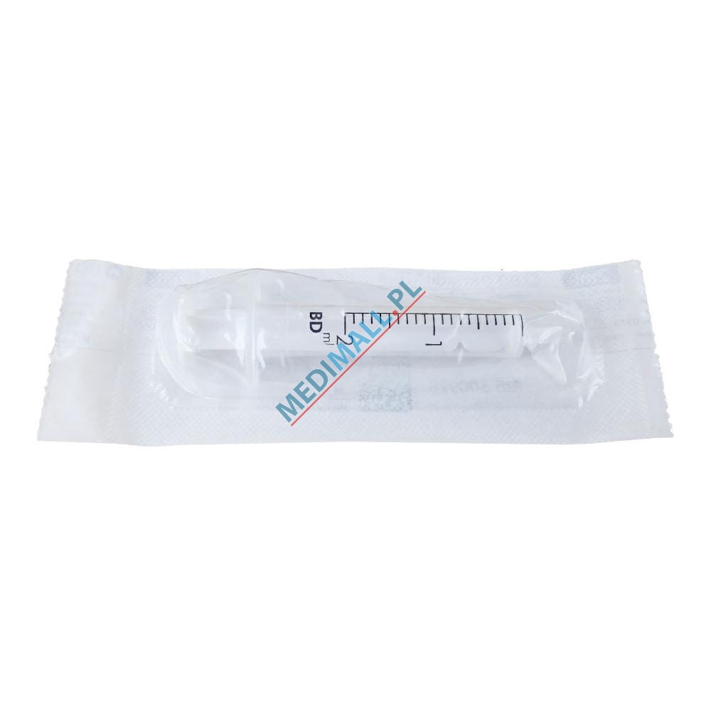 Strzykawka BD o pojemności 2ml złożona z przezroczystego polipropylenowego cylindra i polietylenowego tłoku. Zwartość strzykawki jest doskonale widoczna, a płynny ruch tłoka zmniejsza wymaganą siłę potrzebną do jego przesunięcia – minimalizacja bólu podczas iniekcji. Kołnierz strzykawki został ergonomicznie zaprojektowany, co zapewnia stabilność i komfort użytkowania, ogranicznik na jego końcu uniemożliwia całkowite wysunięcie tłoka. Tłok zaprojektowany tak aby była możliwość obsługi jedną ręką. Strzykawki zapakowane są pojedynczo w blistry papierowo-foliowe, sterylizowane tlenkiem etylenu.Pojemność: 2 ml