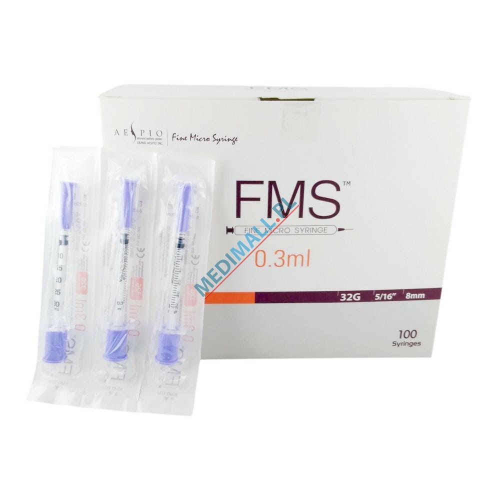 Igła zatsosowana w strzykawkach FMS produkowana jest w technologi ultra cienkiej ścianki i jest jedną z najostrzejszych igieł dostępnych na rynku. Doskonała do wstrzykiwania toksyny botulinowej, kolagenu, kwasu hialuronowego, miejscowych środków znieczulających, mezoterapii, PRP, hialuronidazy, insuliny i innych roztworów. Płynne działanie tłoka – wymaga mniejszej siły nacisku na tłok przy iniekcji (większa precyzja, mniejszy ból i straty na produkcie)ndywidualnie pakowane zapewnienia maksymalną jałowość.Pojemność strzykawki: 0,3 ml