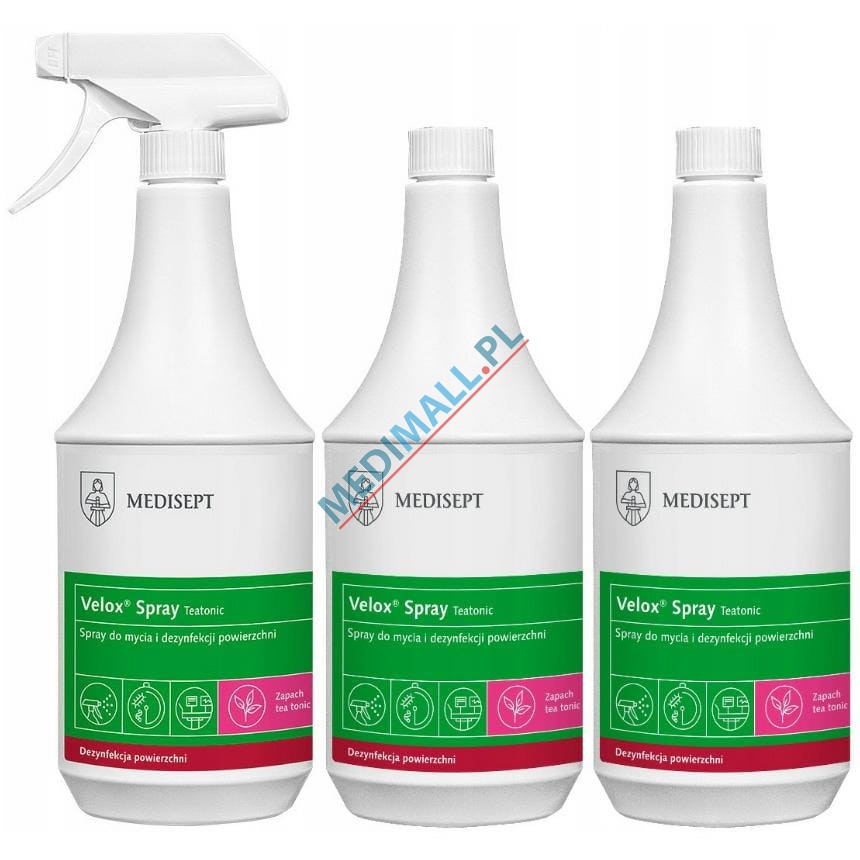 Alkoholowy środek do dezynfekcji sprzętu medycznego (łóżek, foteli, aparatury medycznej etc.) oraz małych powierzchni odpornych na działanie alkoholi. Doskonale sprawdzi się również do dezynfekcji końcówek stomatologicznych i łyżek do wycisków przed sterylizacją. Velox Spray może być stosowany do materiałów mających kontakt z żywnością. Wolny od aldehydu i fenolu. Nie pozostawia smug i szybko odparowuje. Produkt posiada działanie bakteriobójcze, drożdżakobójcze bójcze wobec prątków gruźlicy i ograniczone wirusobójcze (wobec Rotawirusa, Norowirusa) oraz bójcze wobec wirusów osłonkowych (w tym Vaccinia, BVDV, HIV, HBV, HCV).Zapach: Neutral