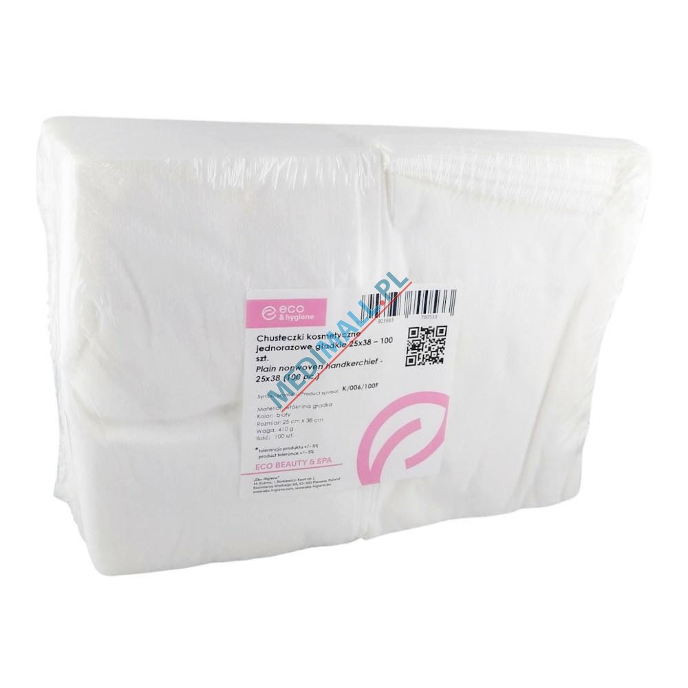 Chusteczki kosmetyczne/zabiegowe wykonane z gładkiej włókniny.Opakowanie: 100 sztuk.