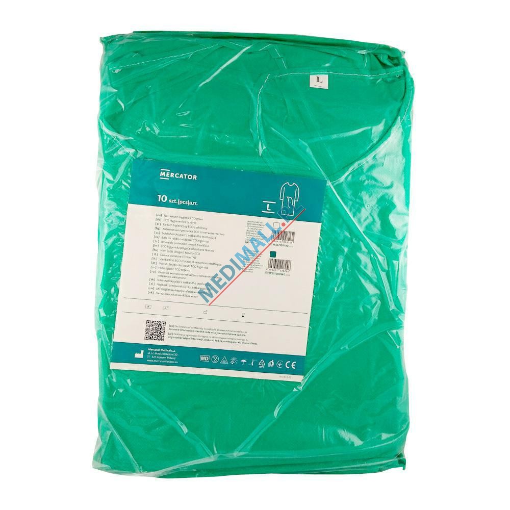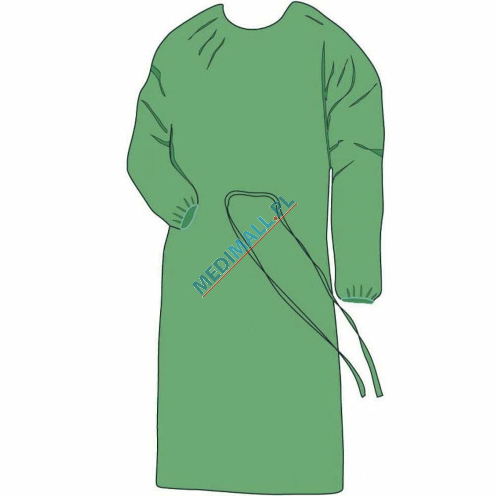 Wykonany z medycznej włókniny o gramaturze 20g / m2. Niesterylny. Fartuch wiązany w pasie na troki oraz z rękawem wykończonym gumką. Zastosowanie takiego mankietu ogranicza wagę oraz objętość fartucha, zmniejszając w ten sposób wielkość odpadu. Fartuch w kolorze zielonym.Opakowanie: 10 sztuk.