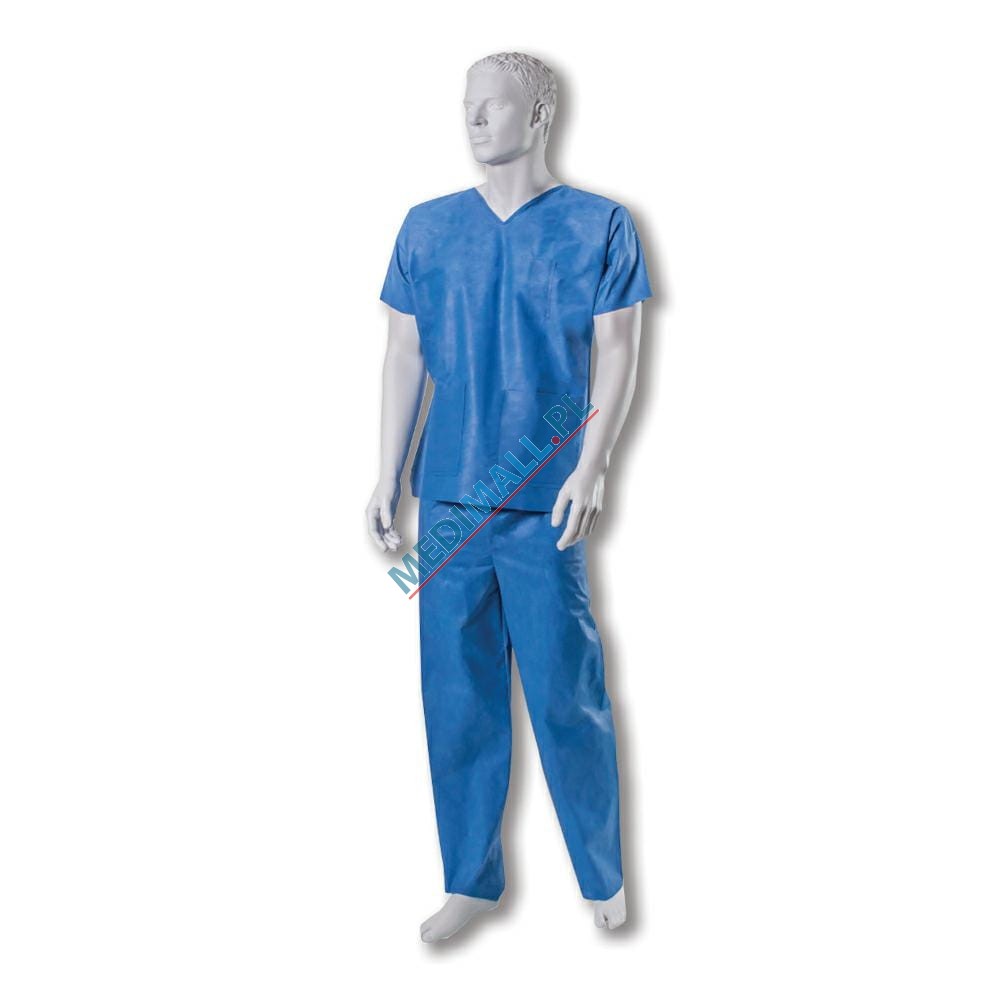 Włókninowa bluza z krótkim rękawem, dekoltem w serem (typu „V”) i trzema kieszeniami oraz spodnie wiązane w pasie na troki. Komplet został wykonany z włókniny typu SMS o grubości 35g/m2 w kolorze niebieskim. Ubranie jest miękkie, przyjemne w dotyku oraz oddychające. Produkt niejałowy, pakowany pojedynczo.