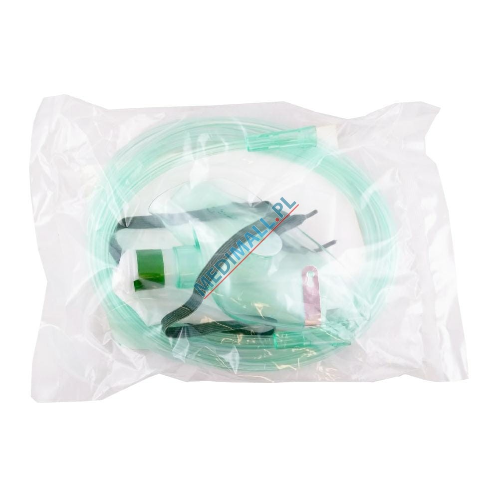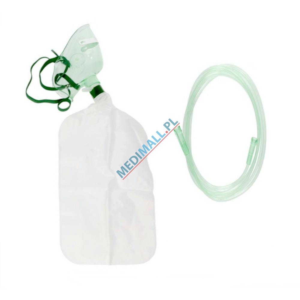 Sterylna maska wykonana z transparentnego, nietoksycznego PCV z workiem. Maska nie zawiera lateksu. Wyposażona w regulowaną blaszkę na nos oraz gumkę mocującą. Dren o długości 2,1m (+-5%) zakończony został uniwersalnym łącznikiem. Dren jest odporny na zagięcia. Maska przeznaczona jest do podawania tlenu o wysokiej koncentracji.