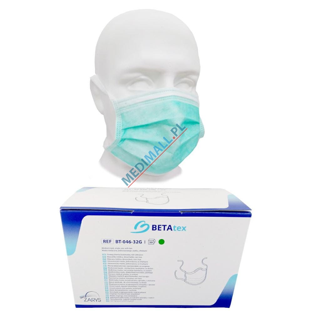 Maski chirurgiczne trójwarstwowe medyczne BETATEX typ II zielone z włókniny na troki 50 sztuk