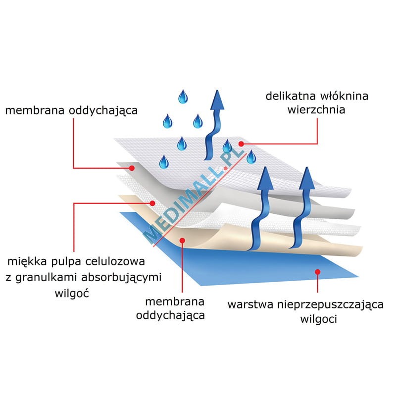 Wielowarstwowa struktura podkładu o wysokim stopniu chłonności sprawia, że już w kilka sekund wilgoć wsiąka do środka zamieniając ją w żel. Warstwa wierzchnia zapewnia uczucie suchości. Zewnętrzna antypoślizgowa powłoka nie przepuszcza wilgoci chroniąc otoczenie i utrzymując podkład we właściwym miejscu.Warstwa chłonna z mikro granulkami -poprawia szybkość wchłaniania, zmniejsza ryzyko wycieku, zatrzymuje wilgoć wewnątrz podkładu, neutralizuje nieprzyjemne zapachy. Zastosowany we wkładzie chłonnym ekstrakt z zielonej herbaty wykazuje właściwości bakteriobójcze, antyalergiczne i aseptyczne.