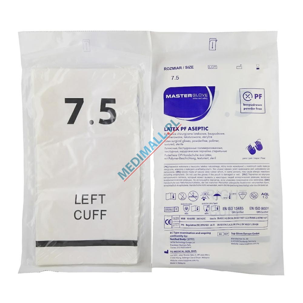 Rękawiczki MASTER GLOVE rozmiar 7,5 LATEX PF ASEPTIC chirurgiczne BEZPUDROWE lateksowe sterylne