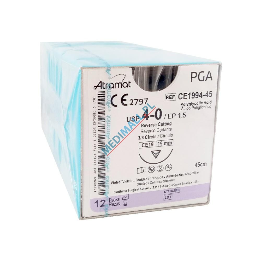 Szwy ATRAMAT PGA 4/0 CE-19 długość 45cm igła 3/8 koło odwrotnie tnąca ref. CE1994-45 (12 szt.)