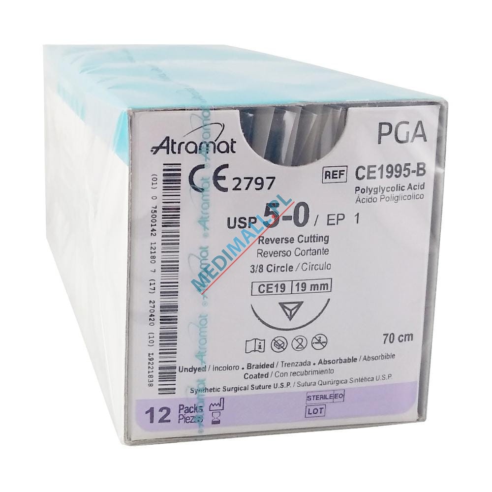 Szwy ATRAMAT PGA 5/0 CE-19 długość 70cm igła 3/8 koło odwrotnie tnąca BEZBARWNE ref. CE1995-B (12 szt.)
