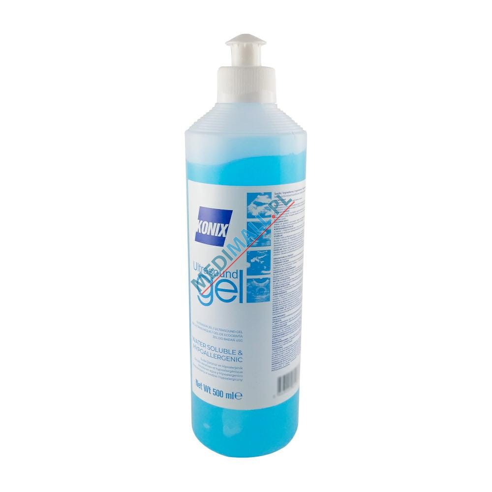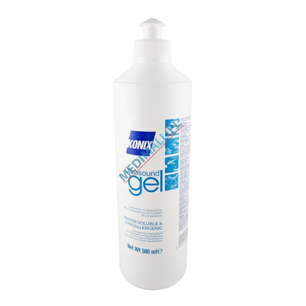 Żel do ultrasonografii, na bazie wodnej, nie zawiera soli, posiada odpowiednią gęstość i lepkość, przeznaczony do diagnostyki (USG, KTG) i terapii ultrasonograficznej (UD). Ogranicza dostęp powietrza między głowicę sondy a skórą pacjenta co zapewnia wyraźniejszy i niezakłócony obraz fal ultrasonograficznych na ekranie monitora.Opakowanie:butelka 500ml